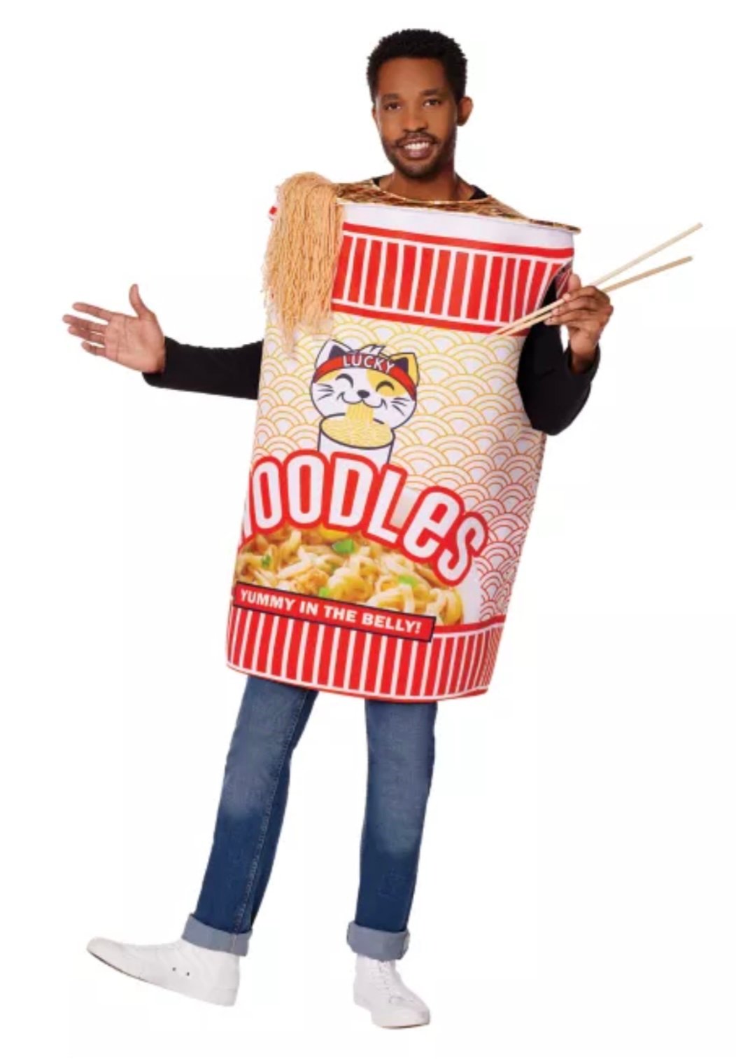 Featuring a vibrant noodle cup design complete with chopsticks and plush noodles spilling out the top, this costume is both cozy and eye-catching. The front showcases an adorable “Lucky Cat” slurping noodles and the phrase "Yummy in the Belly!"—because who doesn't love a warm cup of comfort food?