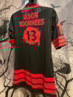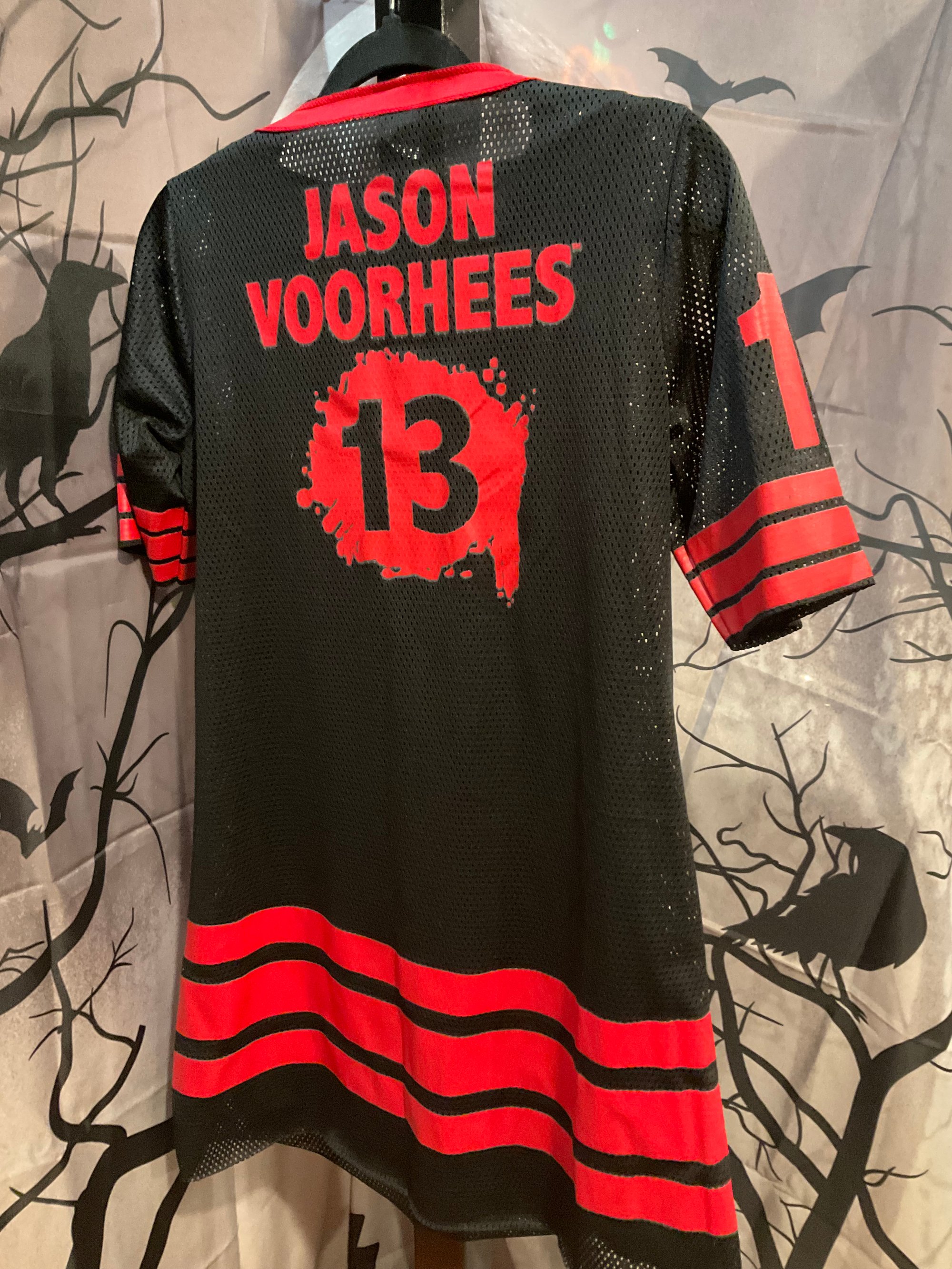 Black and red jersey-style shirt dress featuring a bold blood-splattered mask design, #13 on sleeves and Jason Voorhees on back with #13.