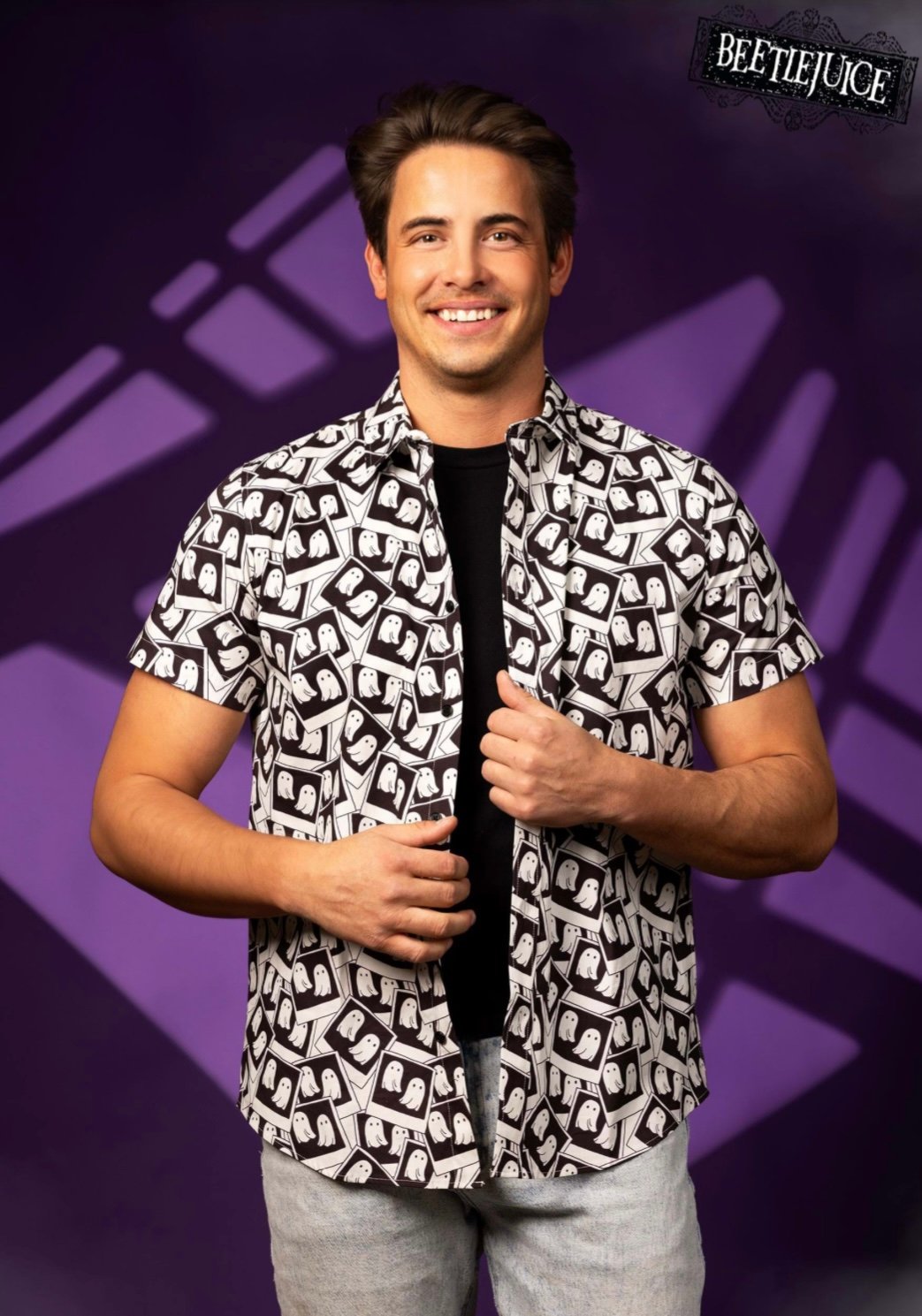 Adult Beetlejuice “Ghostly Photos” Button-Up Shirt (Medium)