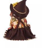 The costume features a cozy patchwork dress with soft textures, playful faux suspenders, and stitched details that mimic hand-sewn charm. The coordinating pointed scarecrow hat, adorned with a cheerful sunflower and yarn “hair,” adds the perfect finishing touch for a picture-perfect fall look.