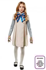 Transform your little one into the iconic AI doll with this officially inspired M3GAN costume dress! Designed for fans of the hit thriller, this child-sized costume (Small) features a stylish tan dress with an attached striped bow, just like the one worn by M3GAN in the movie. Perfect for Halloween, cosplay, themed parties, or dress-up play!