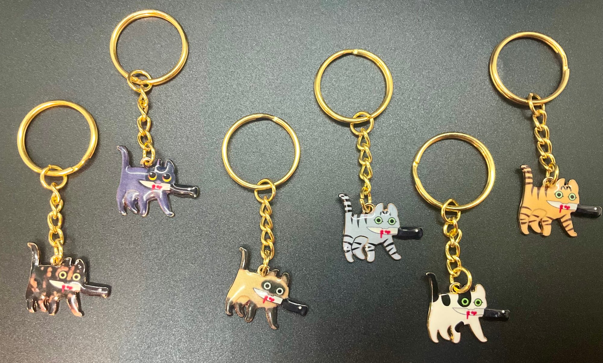 Unleash the chaos with this adorably sinister Cat with Bloody Knife Keychain — the perfect mix of cute and creepy. Featuring a mischievous feline gripping a bloodied blade in its mouth, this keychain is a must-have for cat lovers with a dark sense of humor.