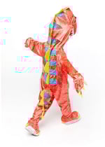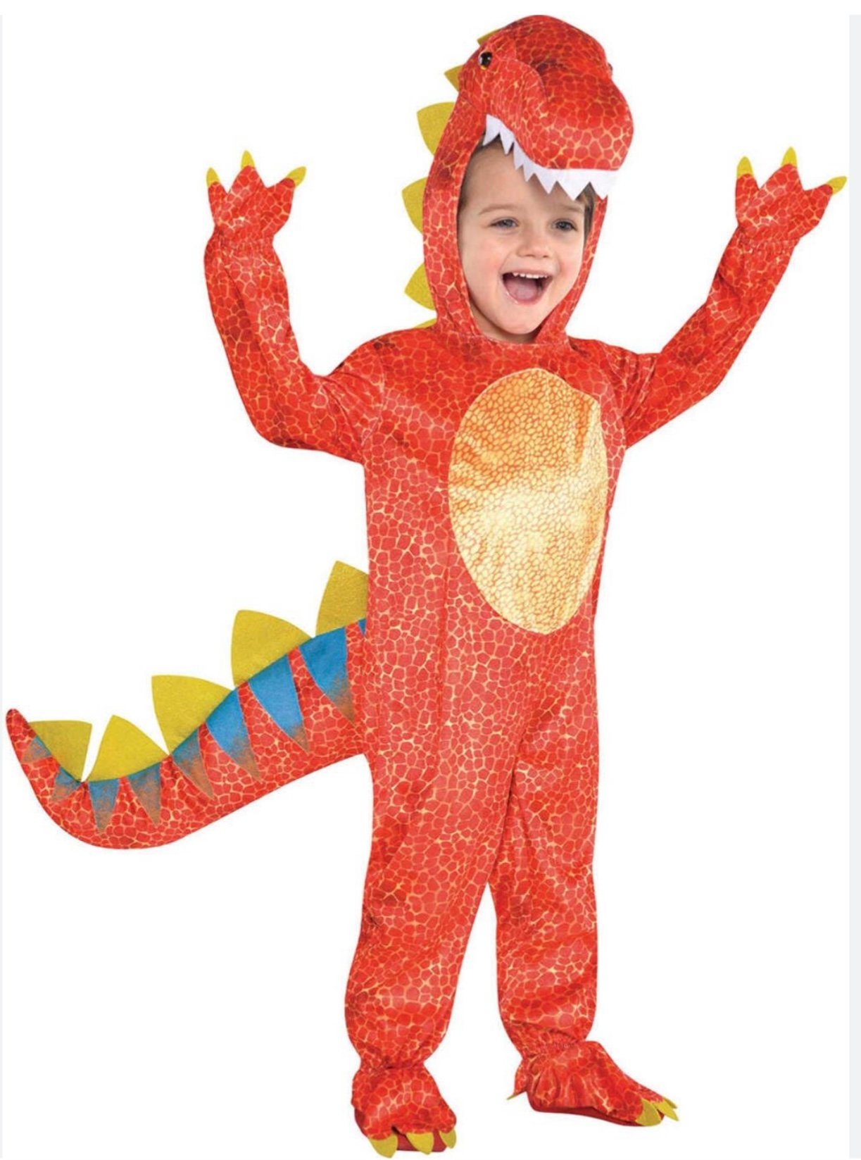 Get ready for some prehistoric fun! Your little one will love stomping, roaring, and playing in this vibrant red/orange dinosaur costume designed for toddlers size 3/4T. Perfect for Halloween, costume parties, or imaginative playtime, this one-piece jumpsuit is bursting with dino-mite details!