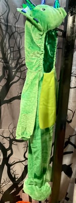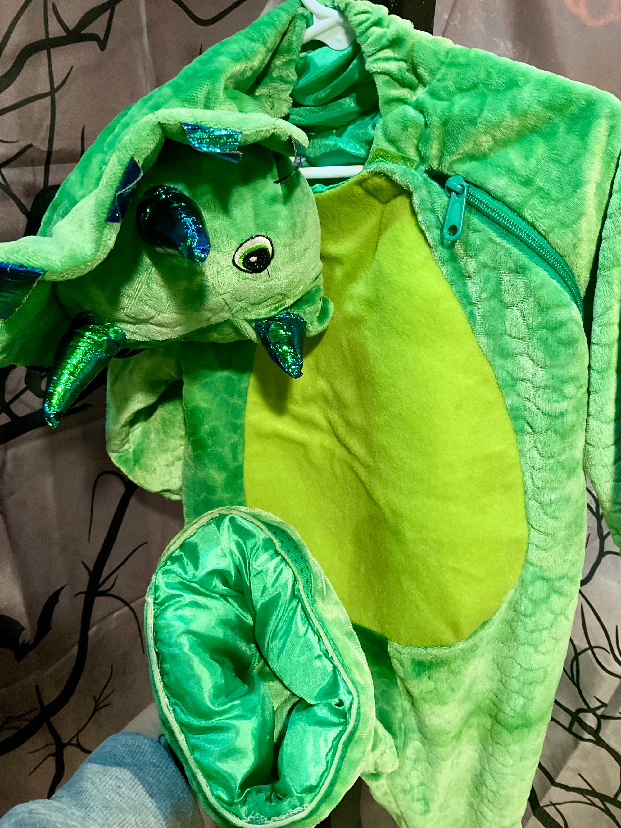 Transform your little one into a prehistoric cutie with this adorable Triceratops Dinosaur Costume! Designed for toddlers aged 18 to 24 months, this plush, soft, and cozy costume features vibrant green and lime colors with shimmering blue horn accents that sparkle under the light. The hood includes an attached triceratops head with embroidered eyes, three shiny horns, and a frilled collar for a truly dino-mite look.
