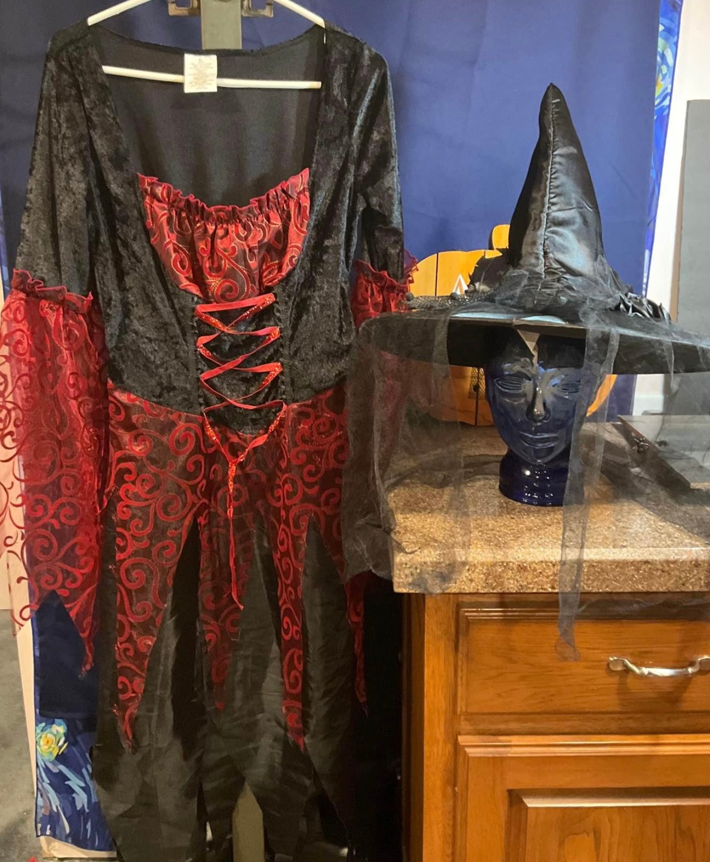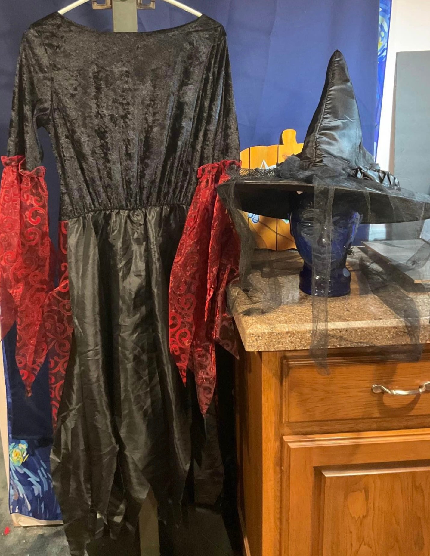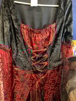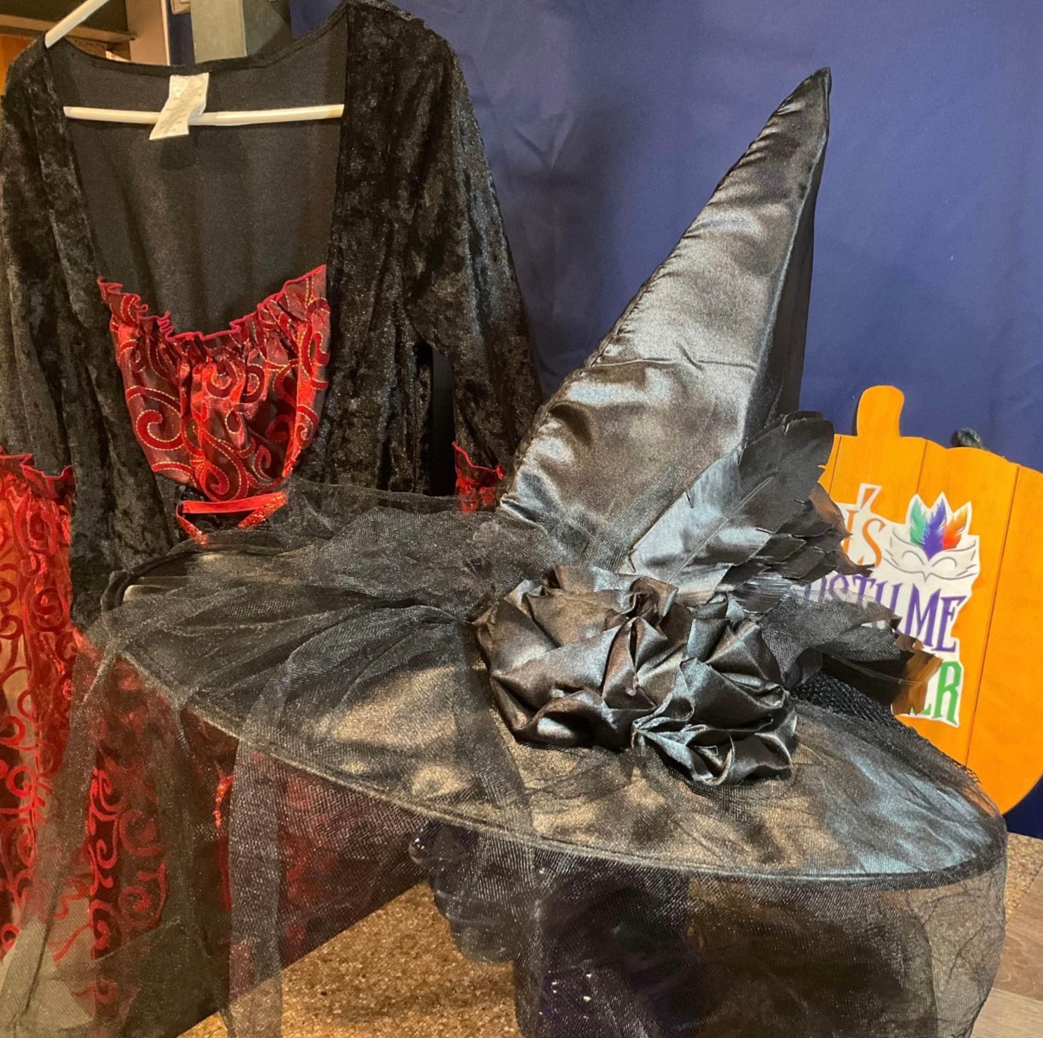 Includes: Full-length black witch dress with red accents and matching pointed witch hat with veil and black roses.