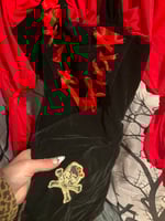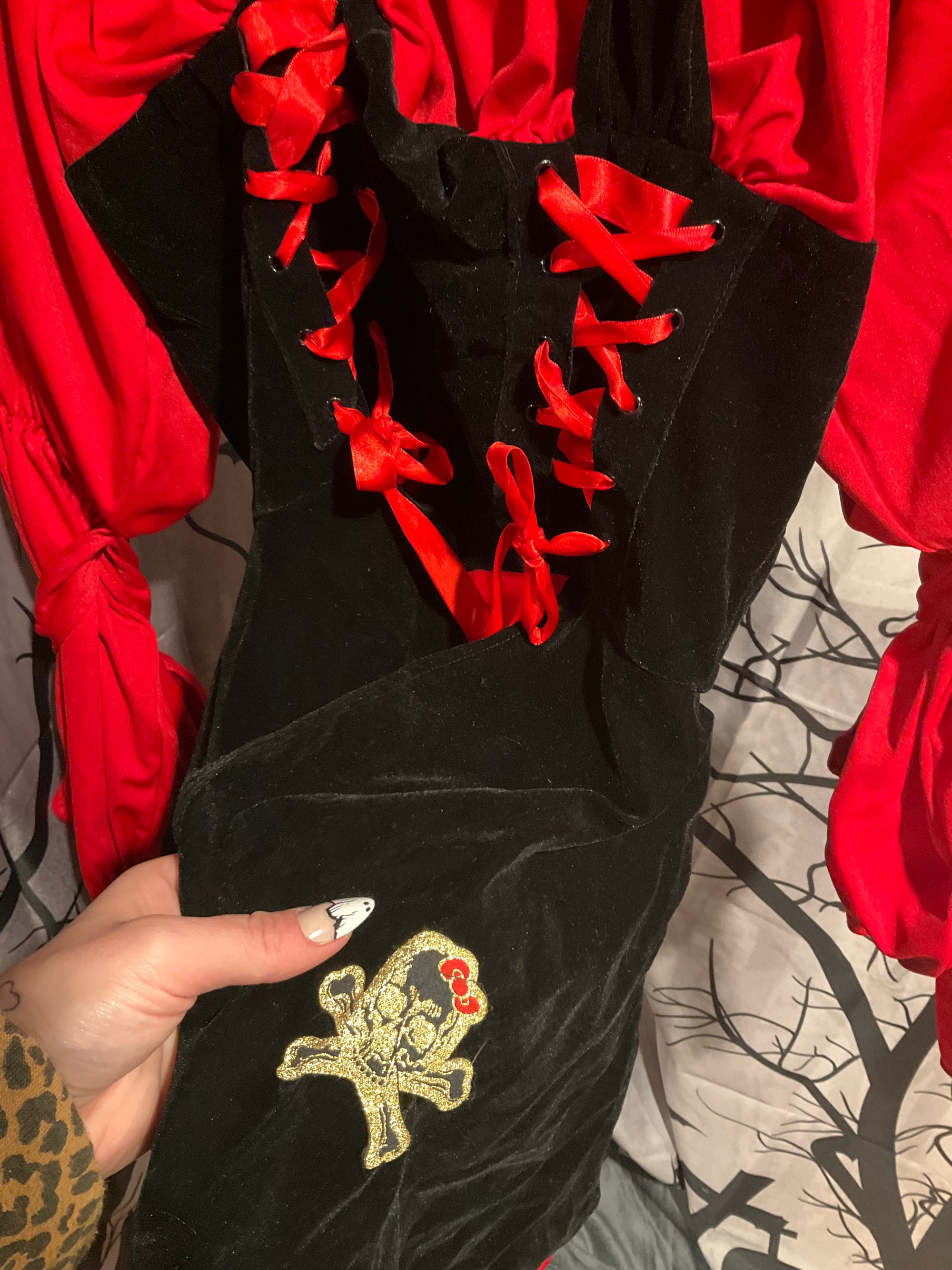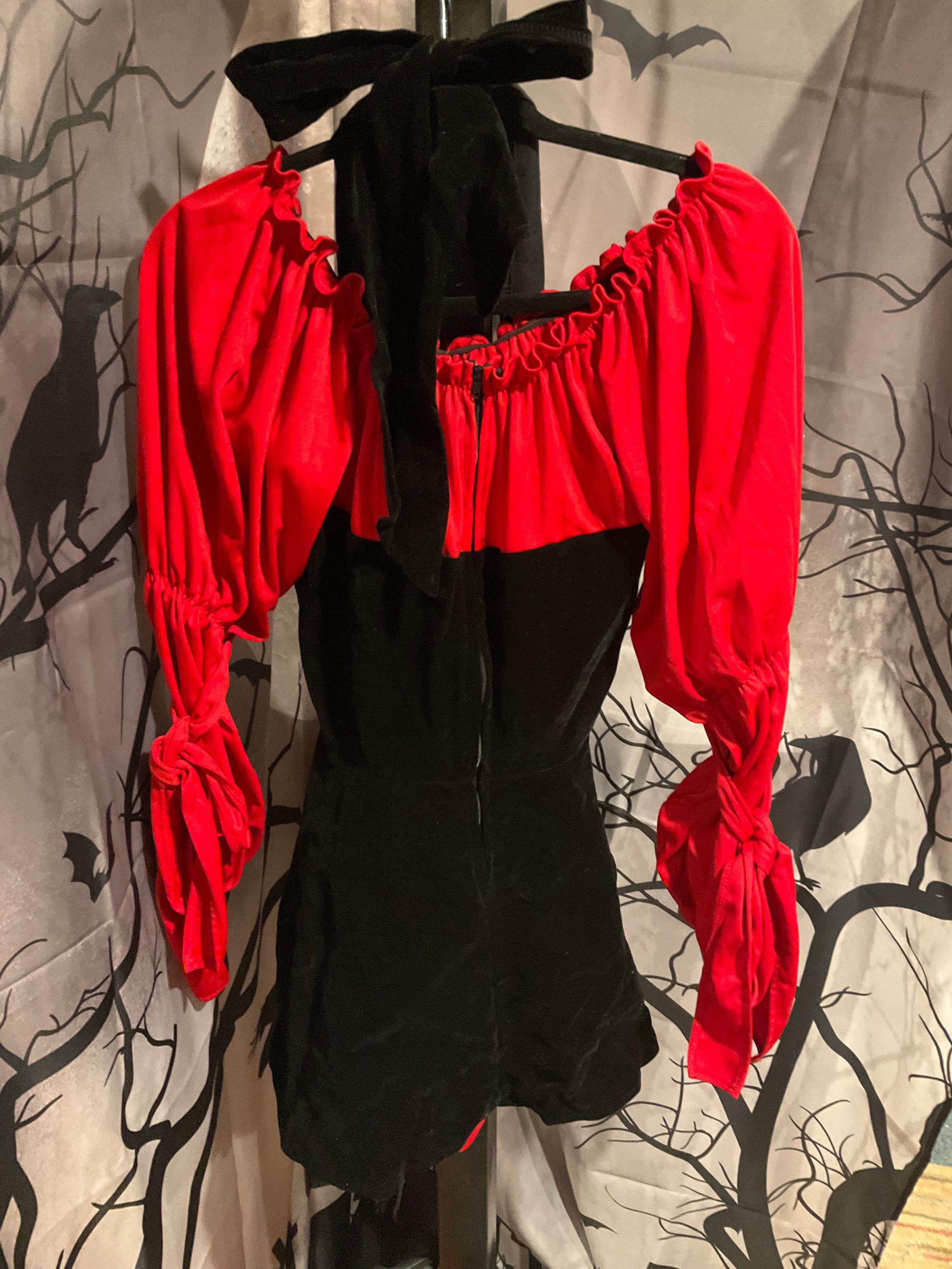 Red and black off-shoulder dress with lace-up front detail and gold embroidered accents, black velvet halter bow.